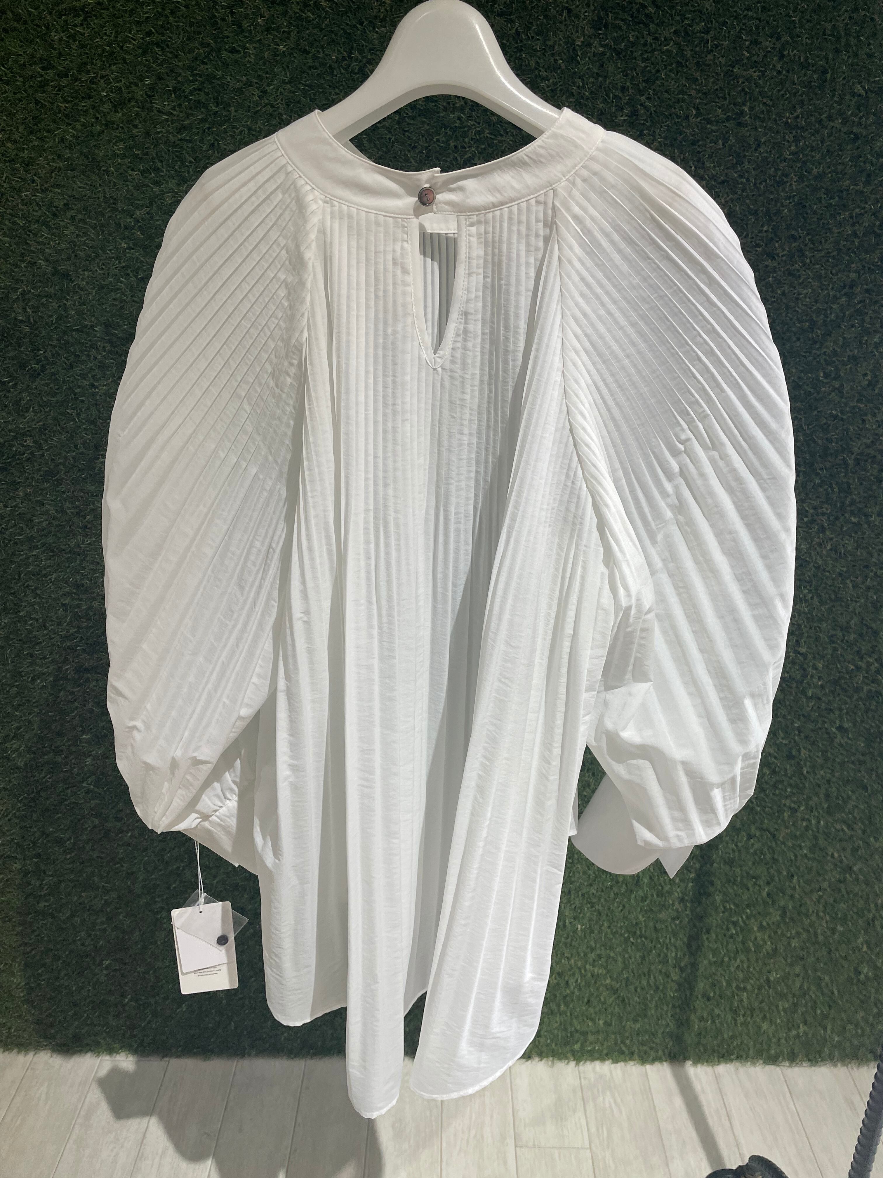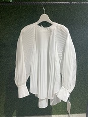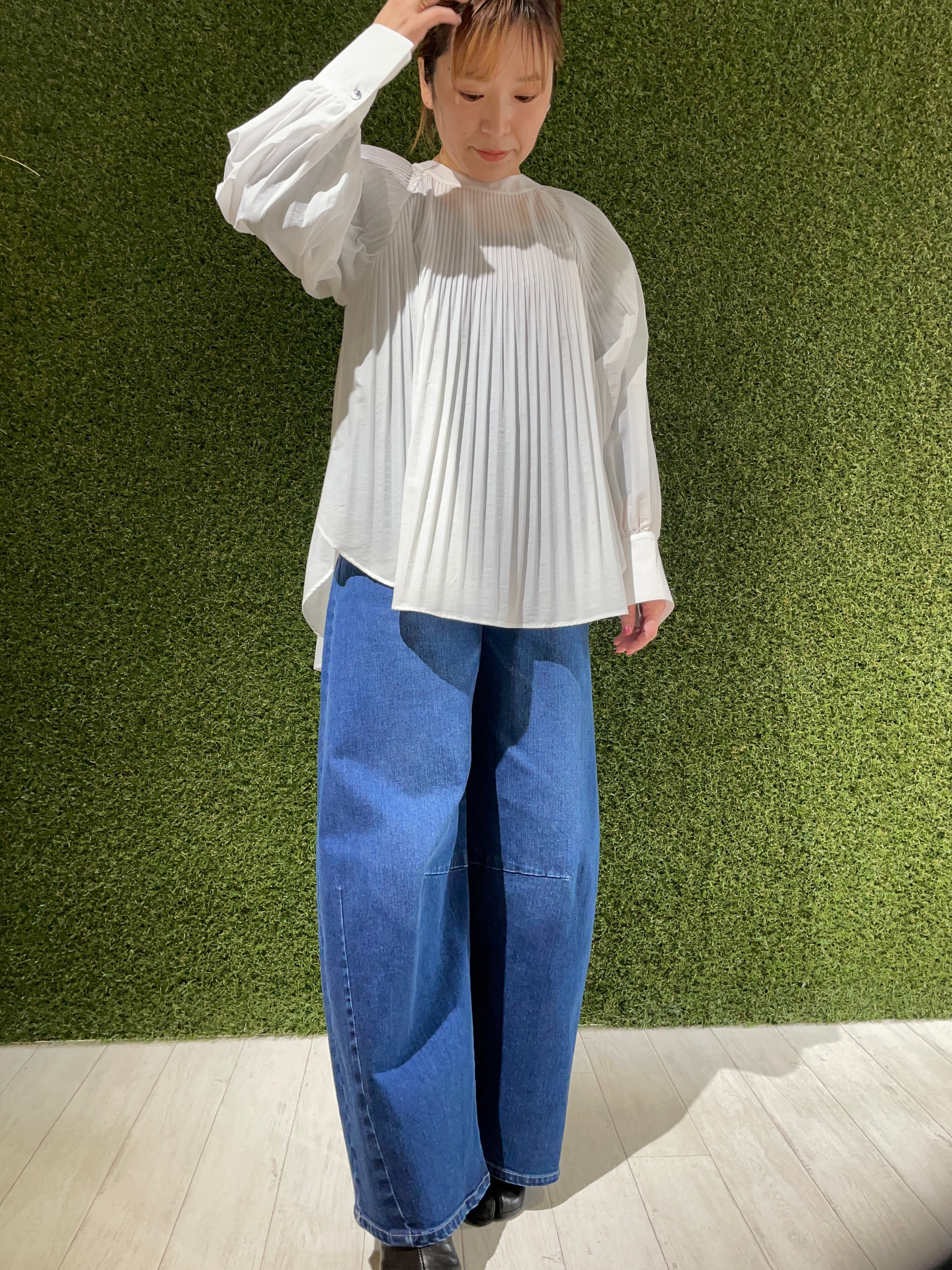 ほんのり透け感のあるプリーツブラウス。