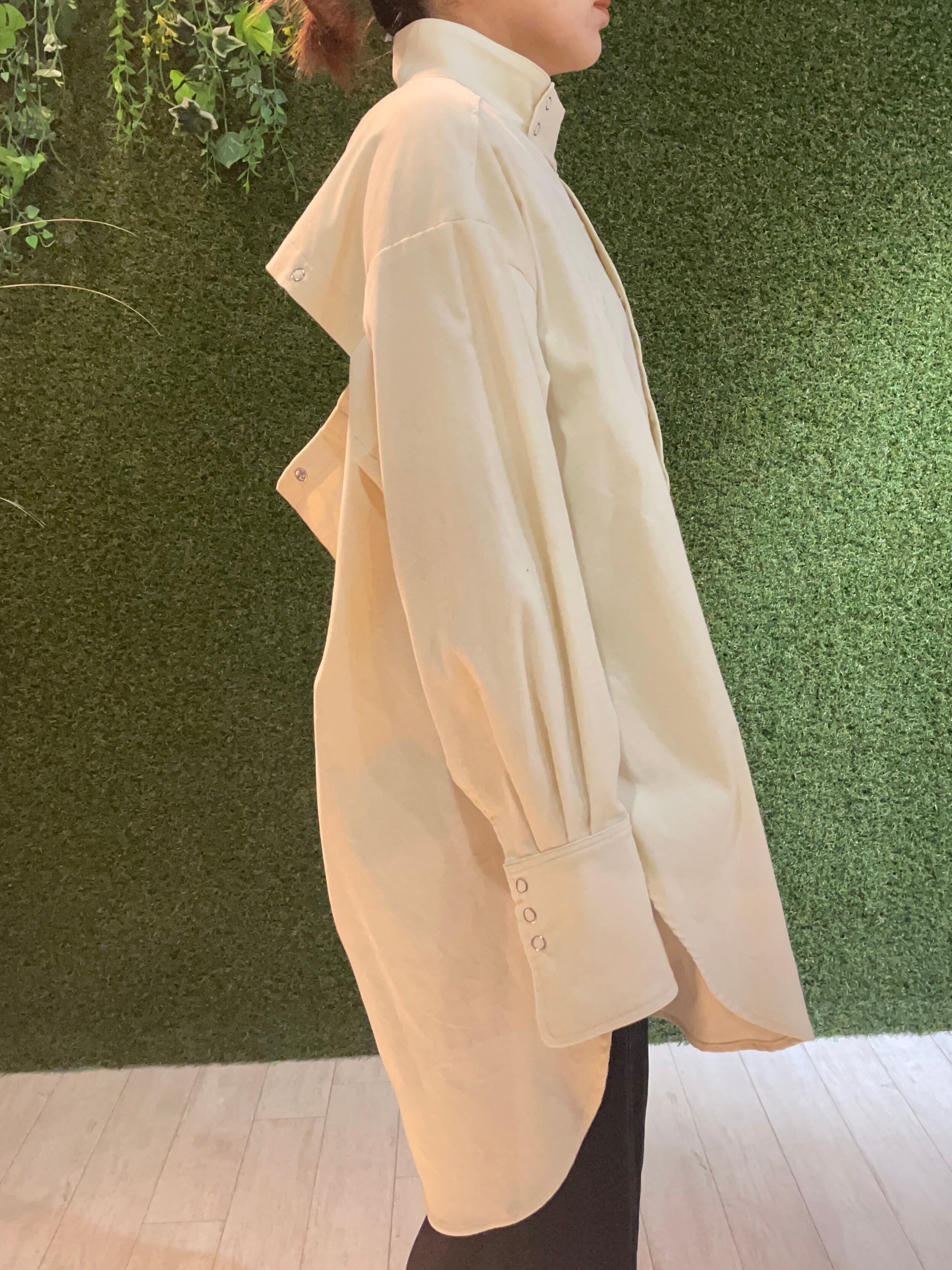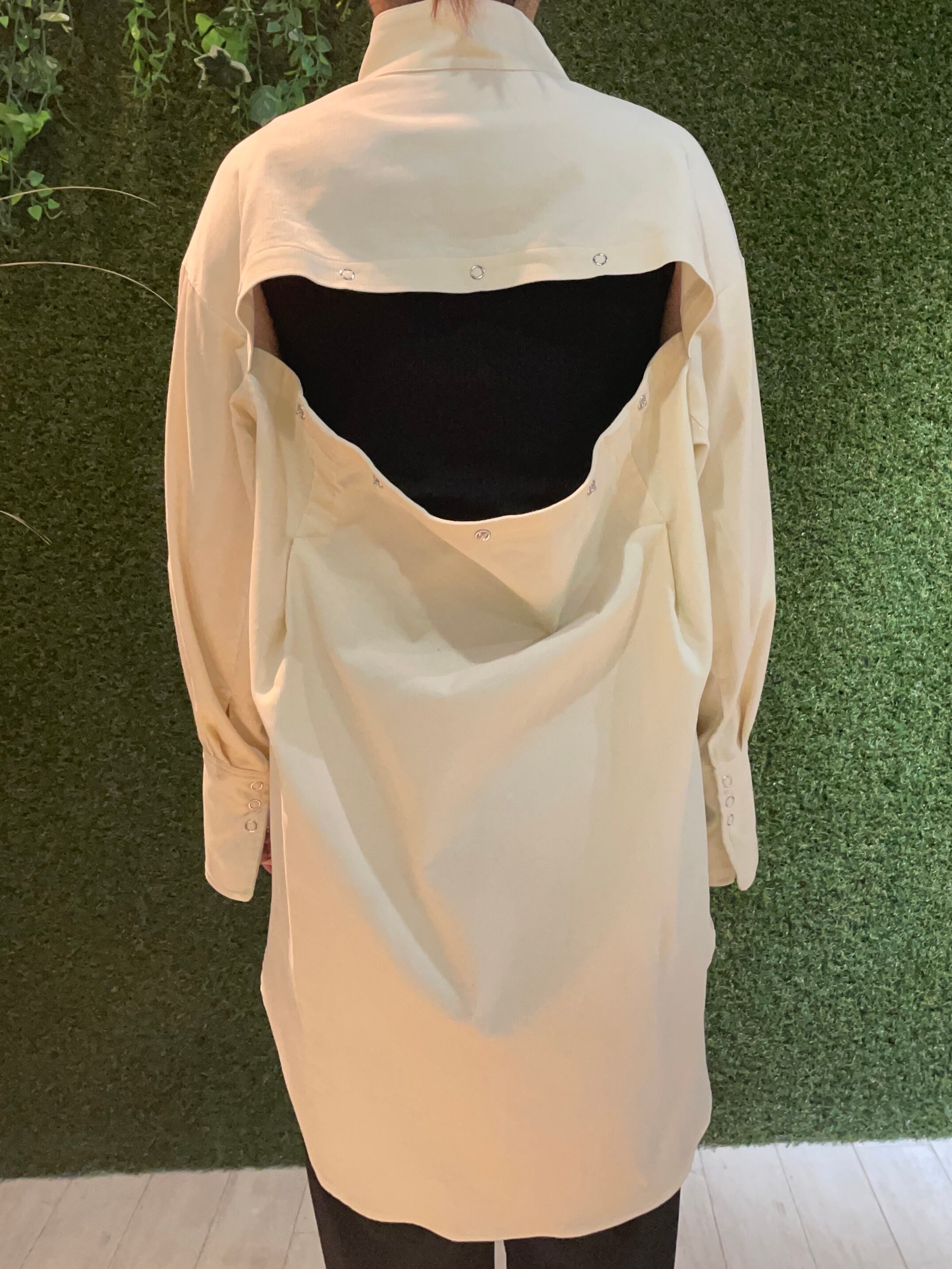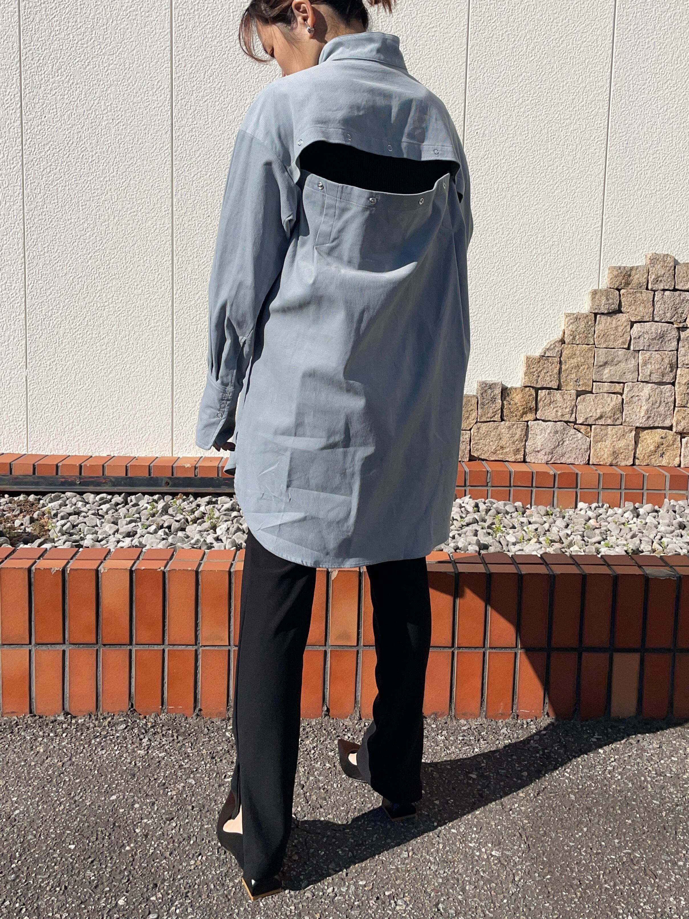 背中の釦を開けてインナーを覗かせるスタイリングもオススメです